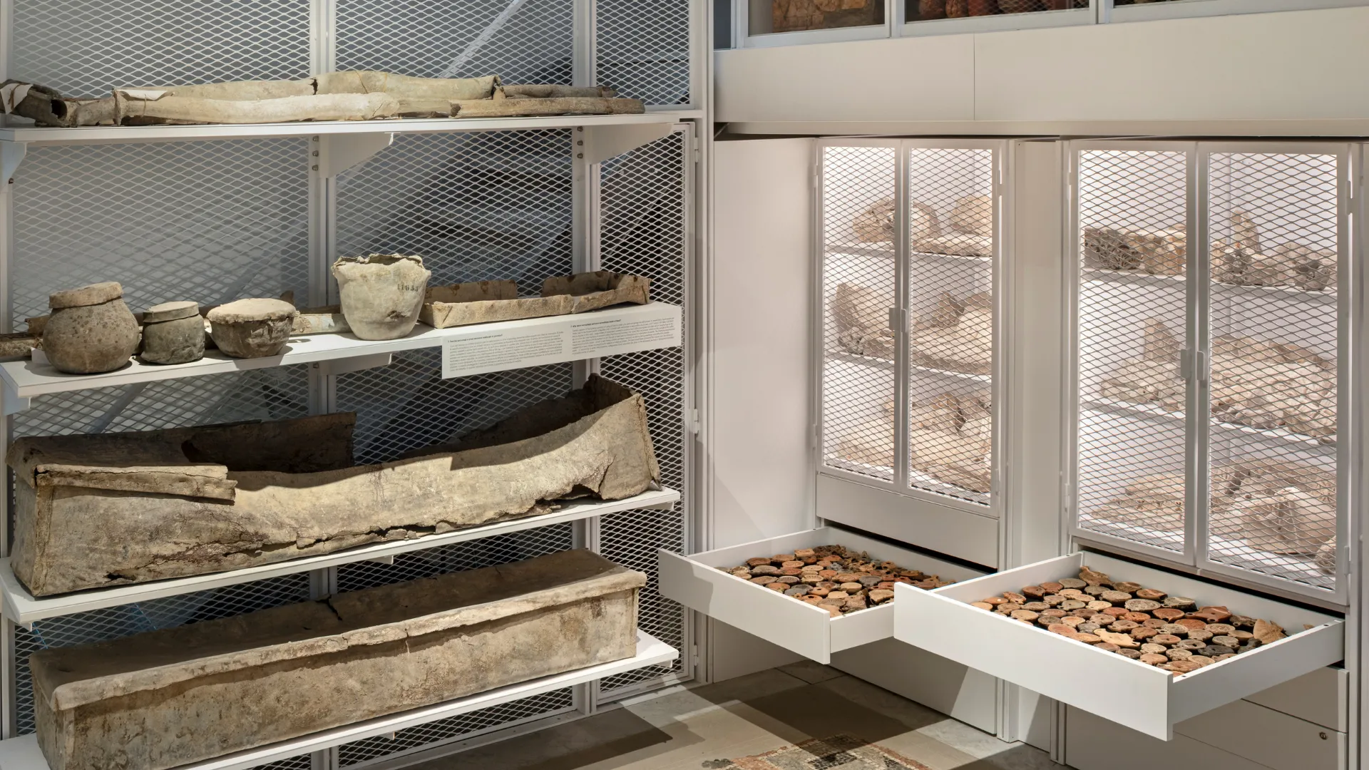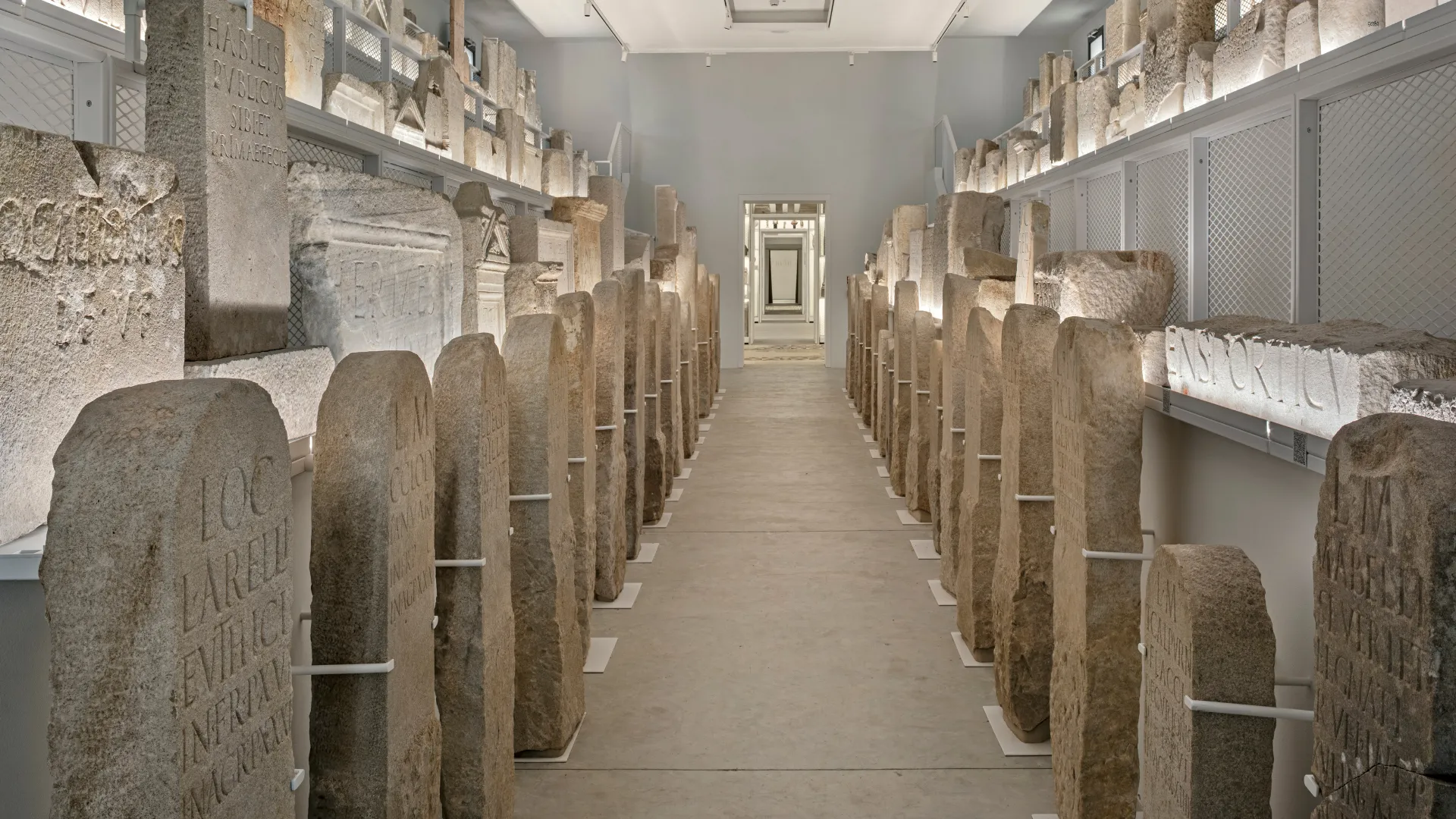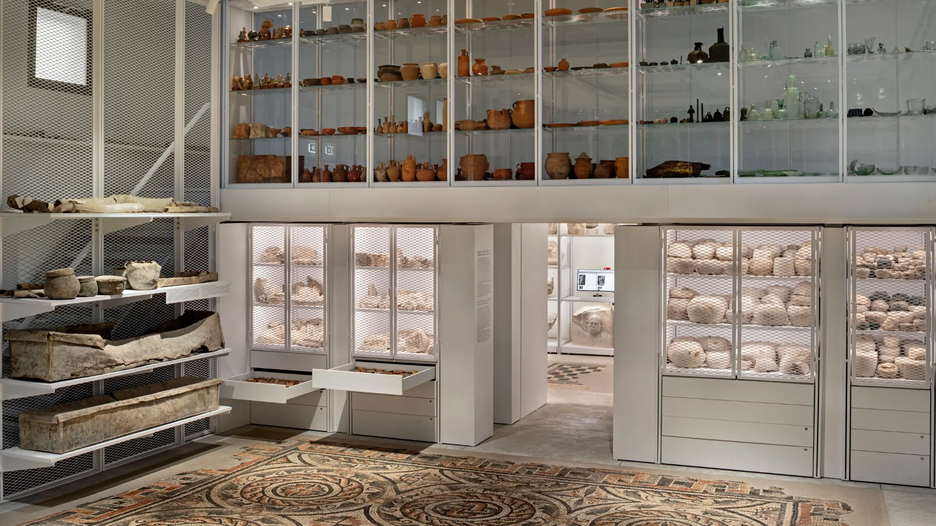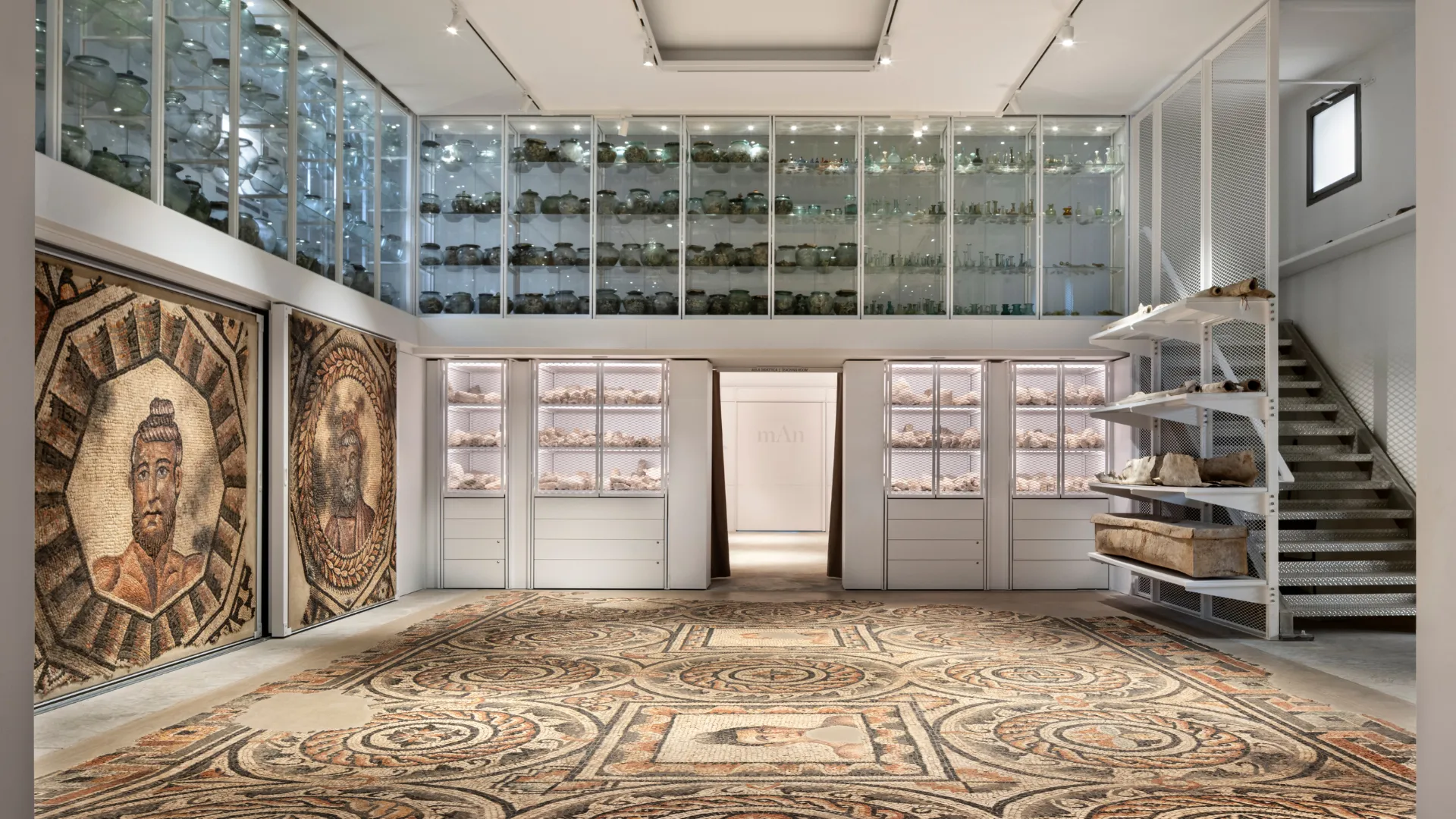 Il progetto ha riguardato il restauro architettonico e impiantistico e il completo riallestimento dei cosiddetti “Grandi magazzini”, costruiti negli anni Cinquanta del Novecento all’interno del suggestivo sistema di gallerie porticate del museo. Le diverse istanze della conservazione, della catalogazione e dell’archiviazione delle migliaia di reperti qui conservati, e prima non esposti al pubblico, hanno dovuto dialogare e coesistere con le necessità di fruizione, comunicazione e accessibilità di una considerevole parte della collezione.