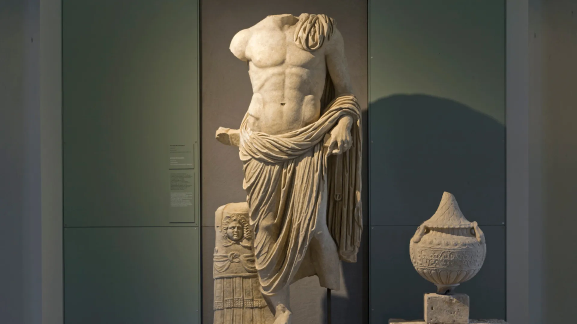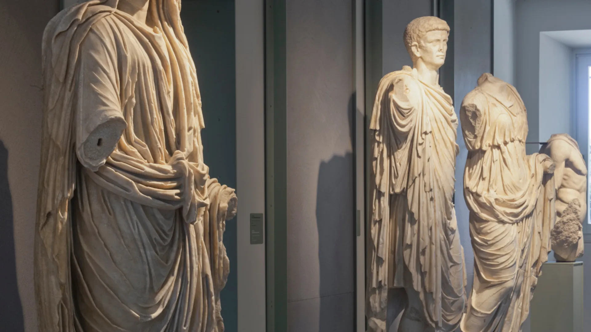 L’imponente statua in marmo raffigura probabilmente un alto ufficiale della flotta navale romana ed è una delle opere più identitarie della collezione.