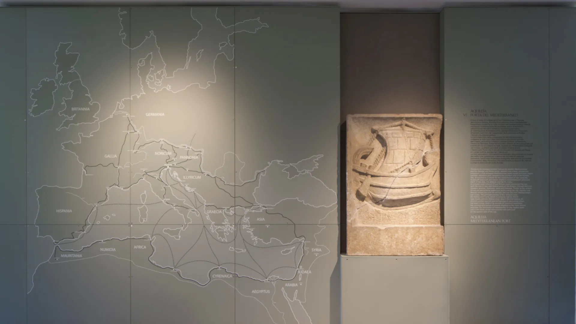 Il percorso di visita prosegue con la sezione dedicata ad Aquileia, porta del Mediterraneo: luogo di incontro, confronto e scambio di persone, idee e merci provenienti dai paesi più remoti dell’Impero. La grande mappa del Mediterraneo apre la sezione, indicando alcune delle rotte commerciali più percorse nel mondo antico. La mappa consente di collocare Aquileia all’interno della fitta rete di contatti tra le grandi città dell’Impero e aiuta il visitatore a comprendere il ruolo di Aquileia quale crocevia e collegamento fra Oriente e Occidente.